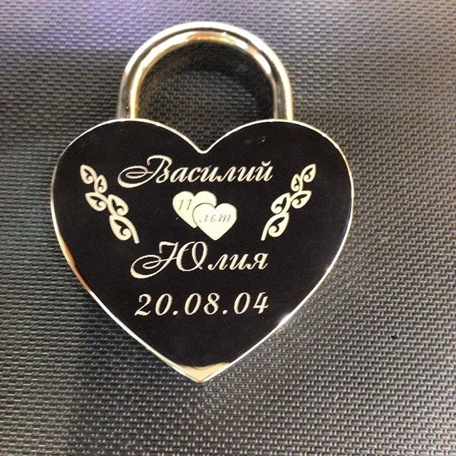 Главная надпись — это, конечно же, имена влюблённых. У нас можно выбрать текст, подобрать рисунок и в течении 20 минут у Вас будет свадебный неповторимый замок, который с гордостью повесите на значимом месте. В наличии имеются замки разных видов и размеров, но наиболее привлекательные из них это конечно же в форме сердца. Мы с радостью оставим приятные воспоминания не только на изделии но и в Вашем сердце!